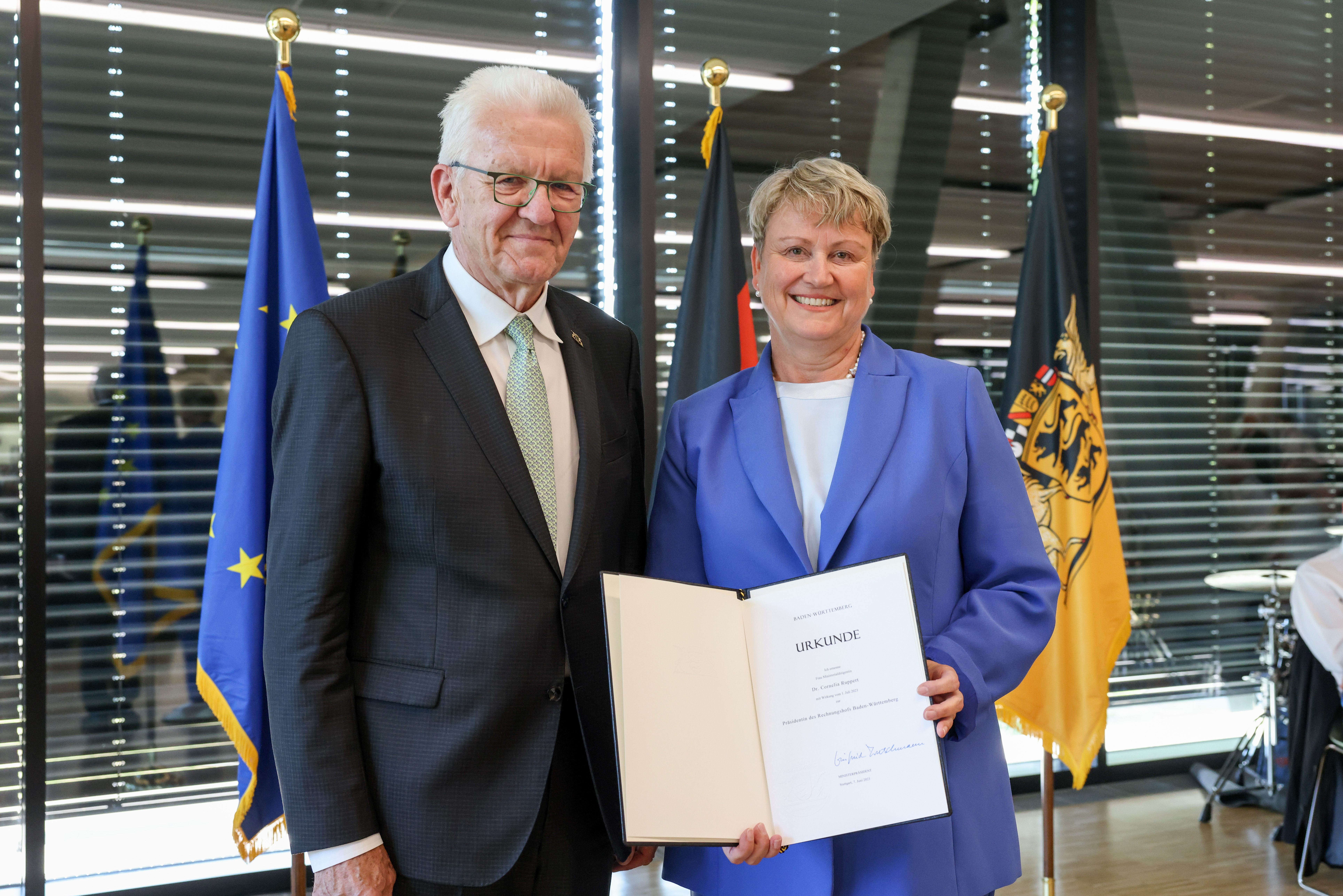 Ministerpräsident Winfried Kretschmann hat Dr. Cornelia Ruppert als neue Präsidentin des Rechnungshofs Baden-Württemberg in ihr Amt eingeführt. Zuvor verabschiedete er ihren Vorgänger Günther Benz und dankte ihm für seine Arbeit.