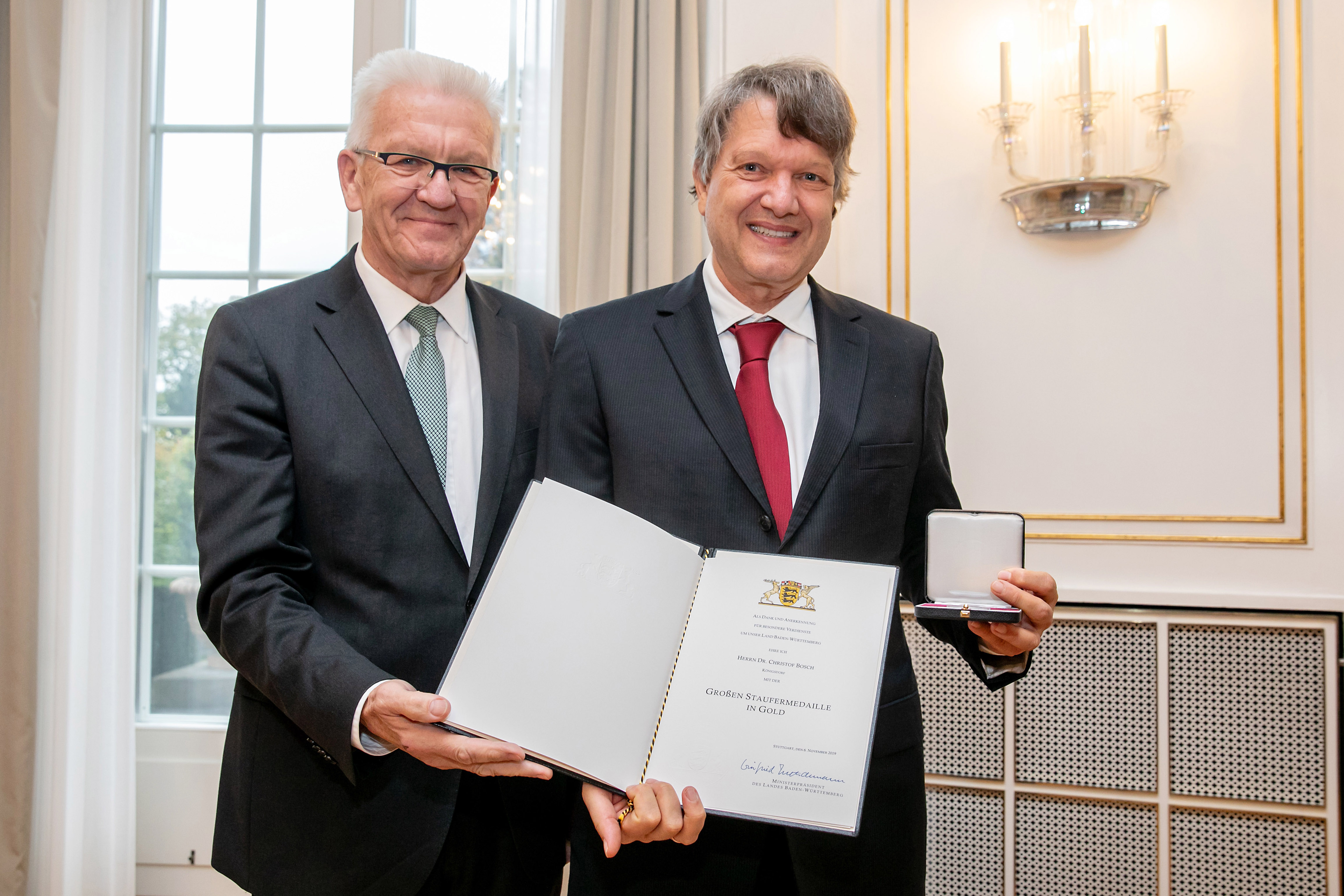 Ministerpräsident Winfried Kretschmann hat Dr. Christof Bosch die Große Staufermedaille in Gold verliehen und seine großen Verdienste um das Gemeinwesen als Ideen- und Impulsgeber und Nachhaltigkeitsexperte gewürdigt.