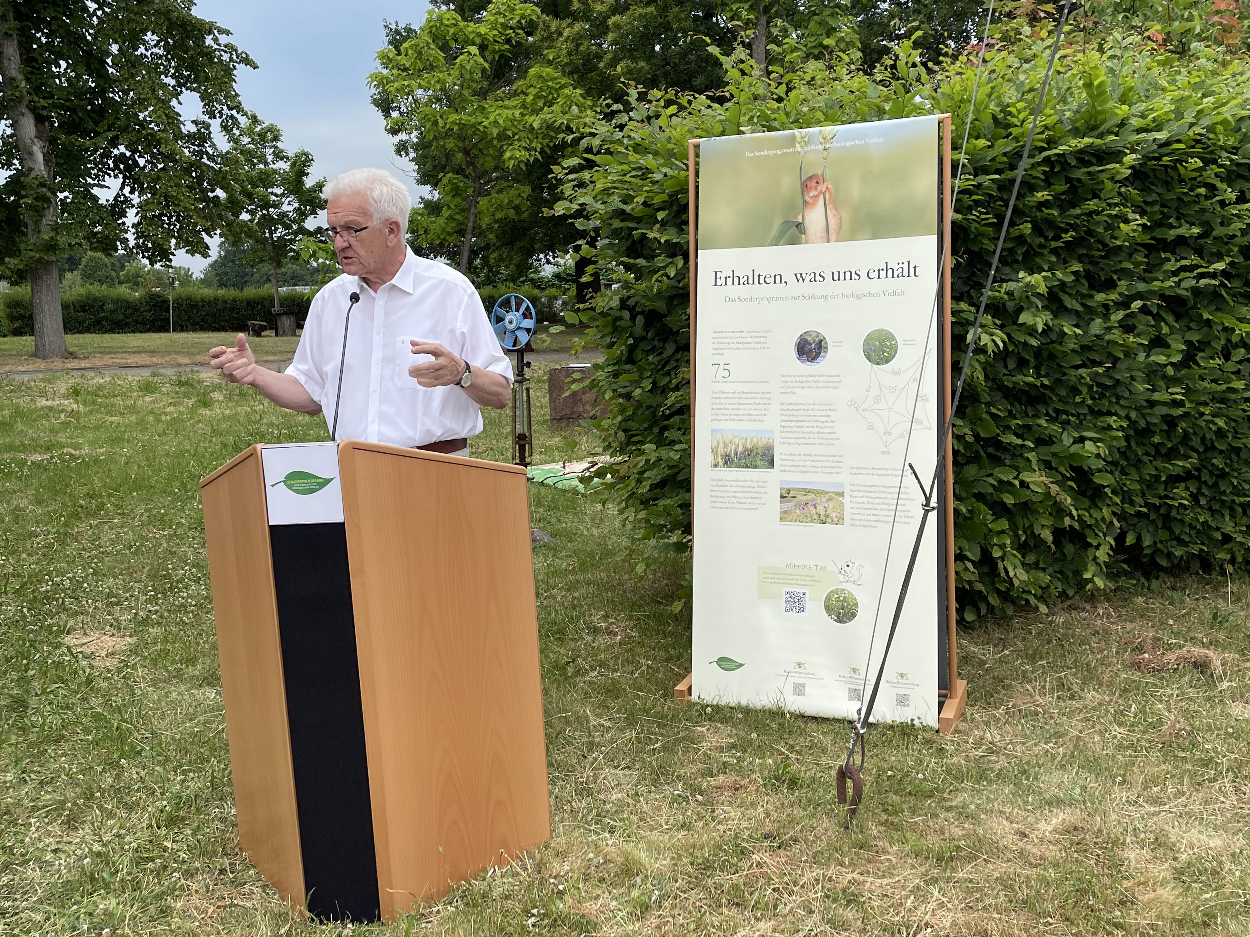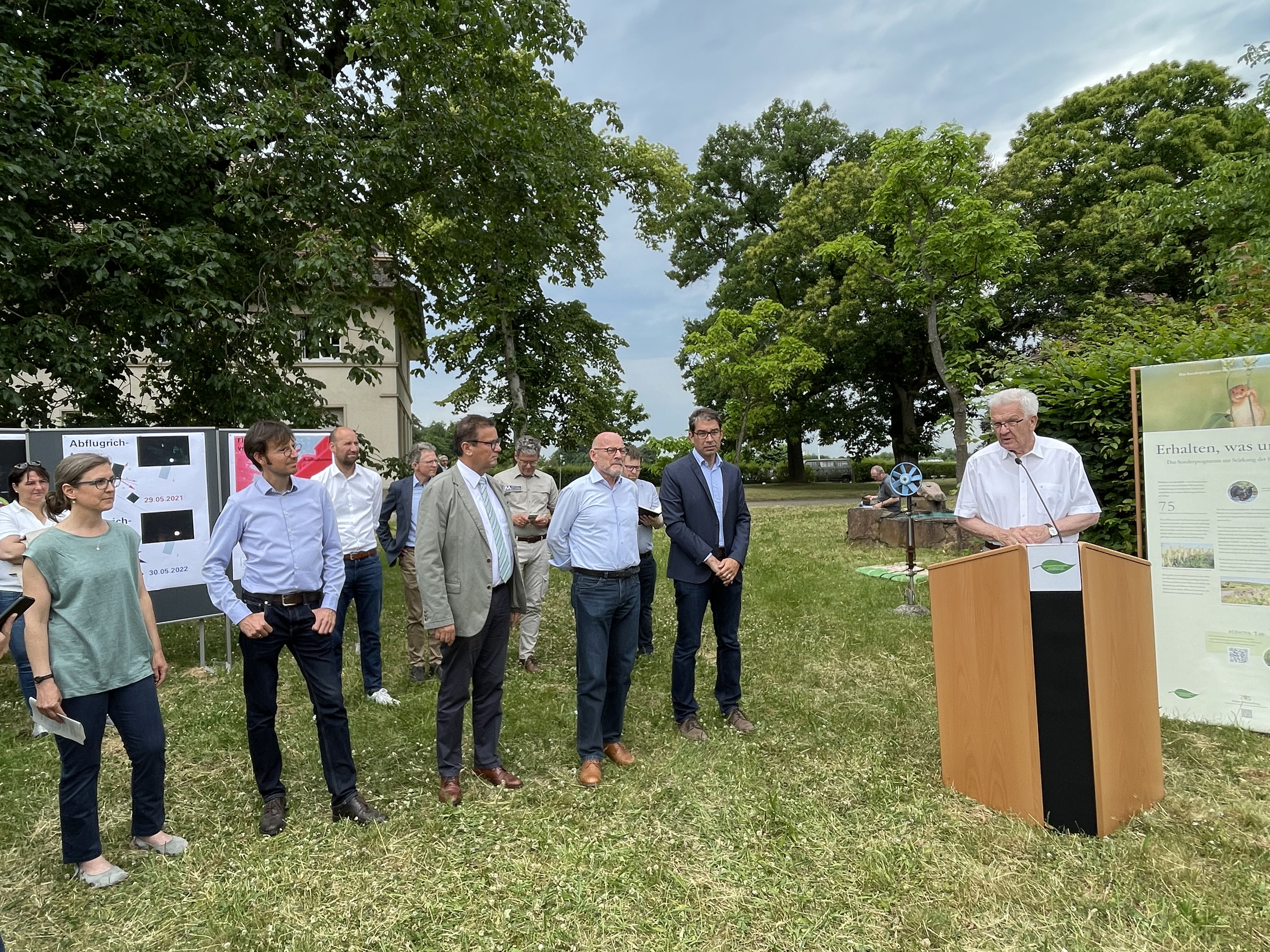 Mit einer Bus-Rundreise haben Ministerpräsident Winfried Kretschmann, Landwirtschaftsminister Peter Hauk, Verkehrsminister Winfried Hermann und Umweltstaatssekretär Andre Baumann vier beispielhafte Projekte des Sonderprogramms in den Landkreisen Karlsruhe und Rastatt besichtigt.