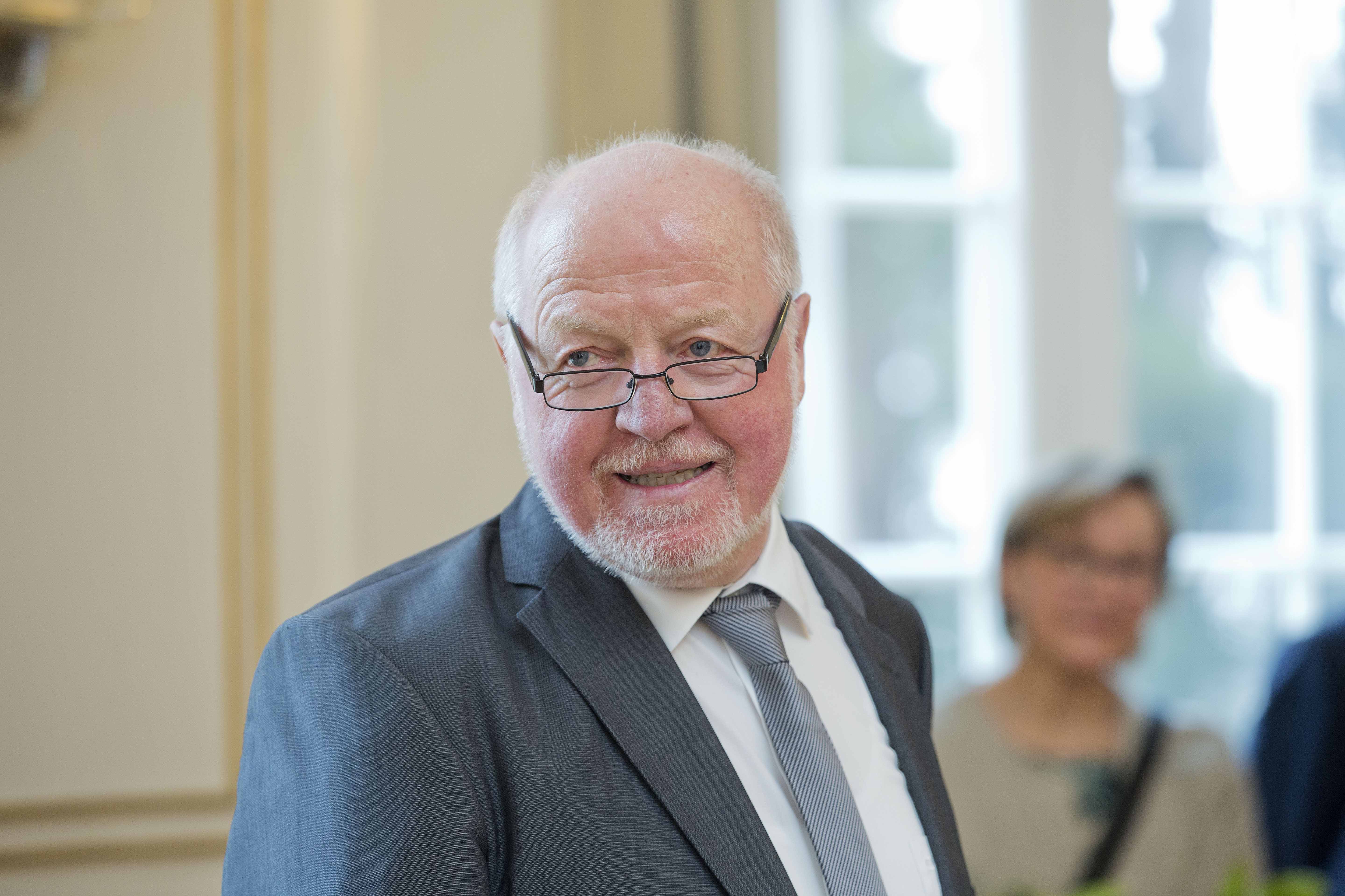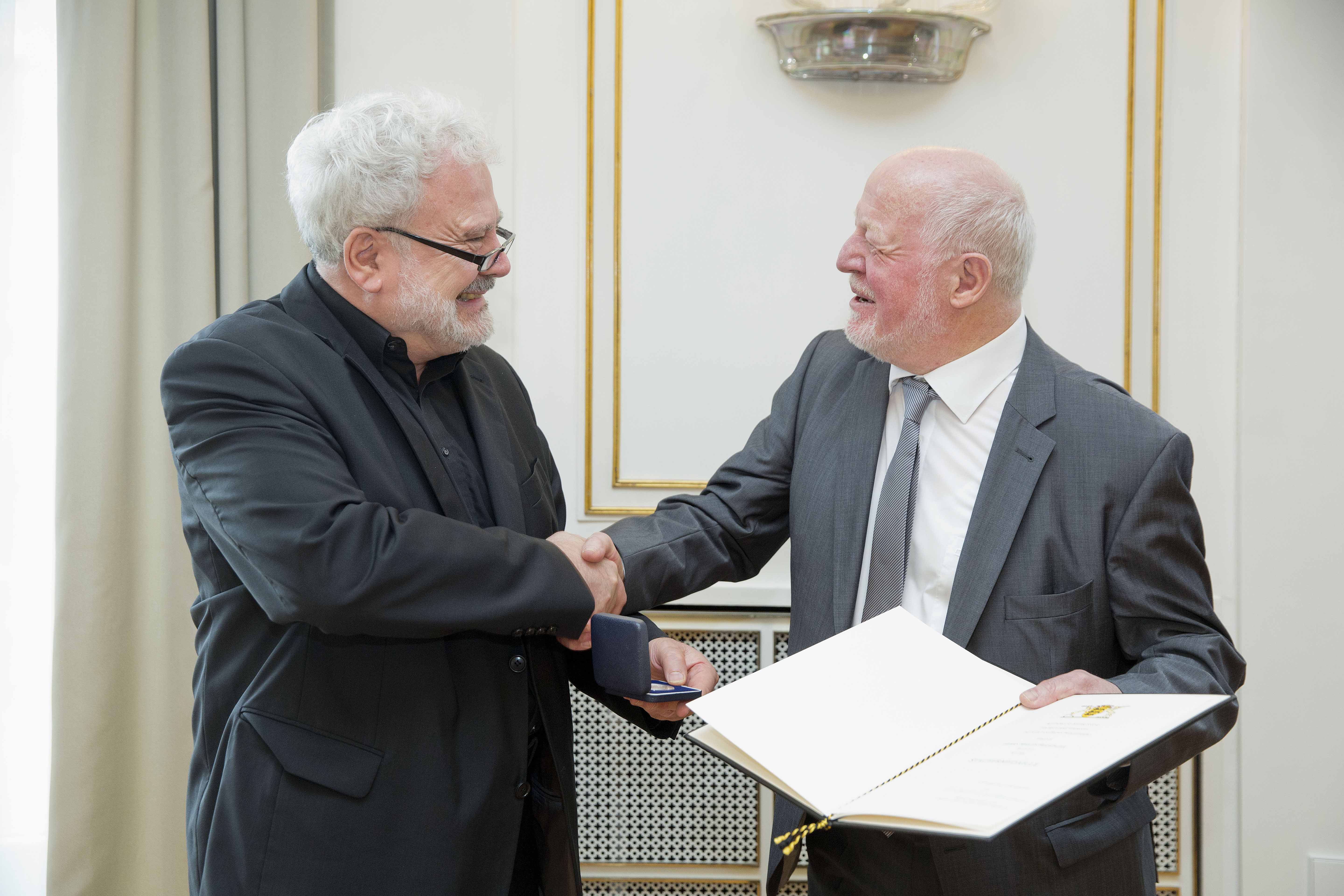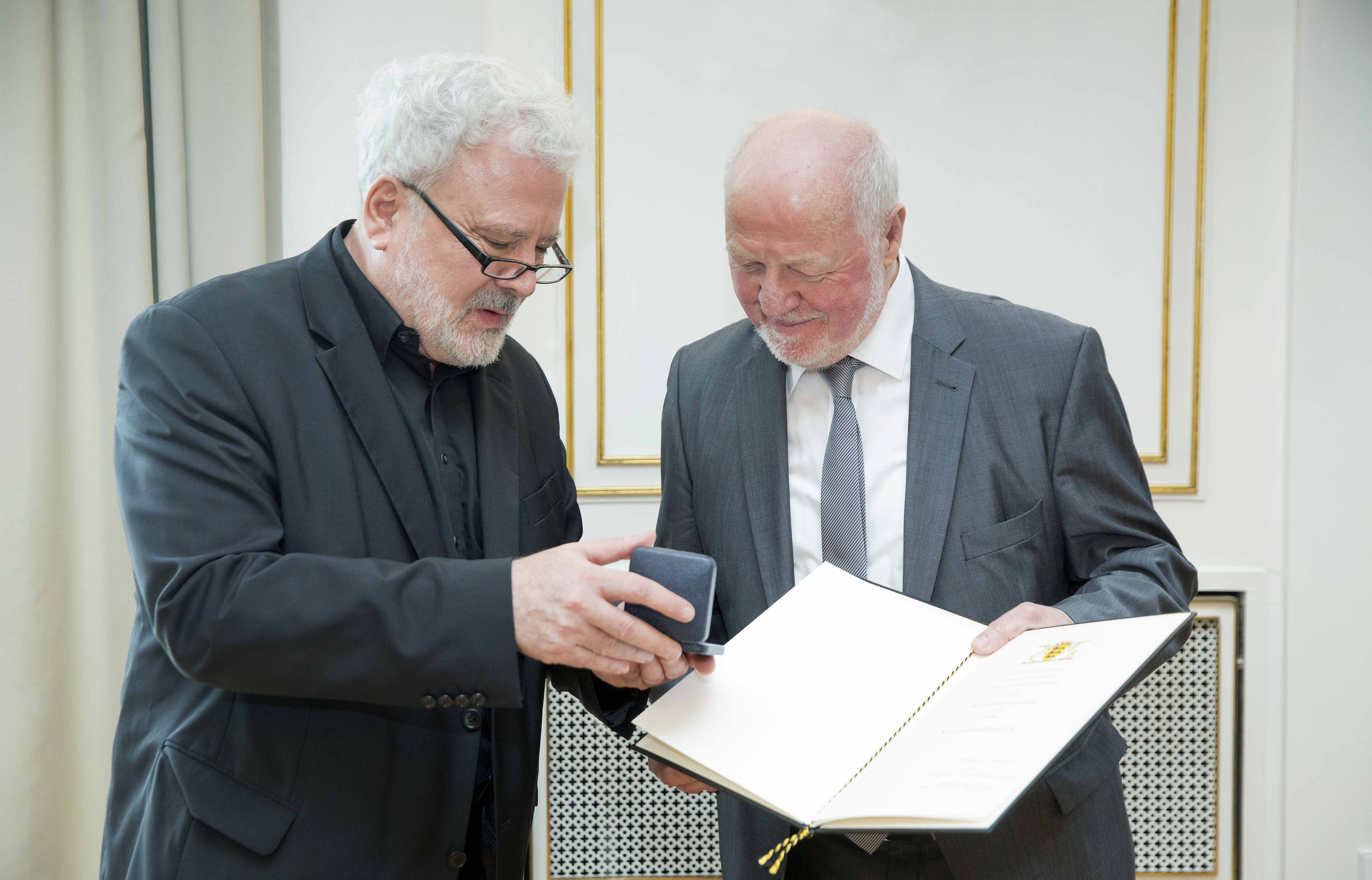 Staatsminister Klaus-Peter Murawski hat Martin Hechinger die Staufermedaille überreicht.