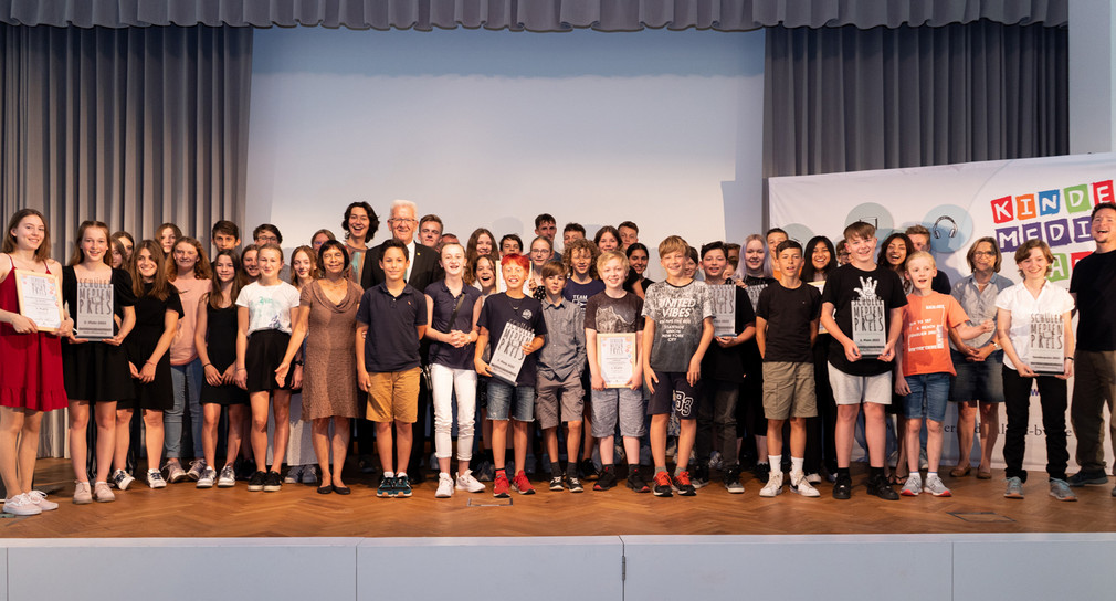 Ministerpräsident Winfried Kretschmann hat den Schülermedienpreis Baden-Württemberg an die Gewinnerinnen und Gewinner überreicht. Mit dem Preis der Initiative Kindermedienland werden selbst erarbeitete Medienprojekte von Schülerinnen und Schülern des Landes prämiert.