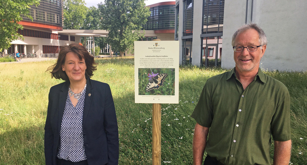 Mehr Lebensraum für Tiere schaffen und die Artenvielfalt steigern: Das sind die Ziele, die sich das Land Baden-Württemberg für rund 110.000 Quadratmeter landeseigener Liegenschaften in Karlsruhe gesteckt hat. Die Flächen werden künftig ökologisch gepflegt. Bislang regelmäßig gemähte Rasenstücke sollen zu blühenden Wiesen werden, wo vor allem Insekten neue Lebensstätten finden. Mit Schildern wird auf die ökologische Grünflächenpflege hingewiesen.