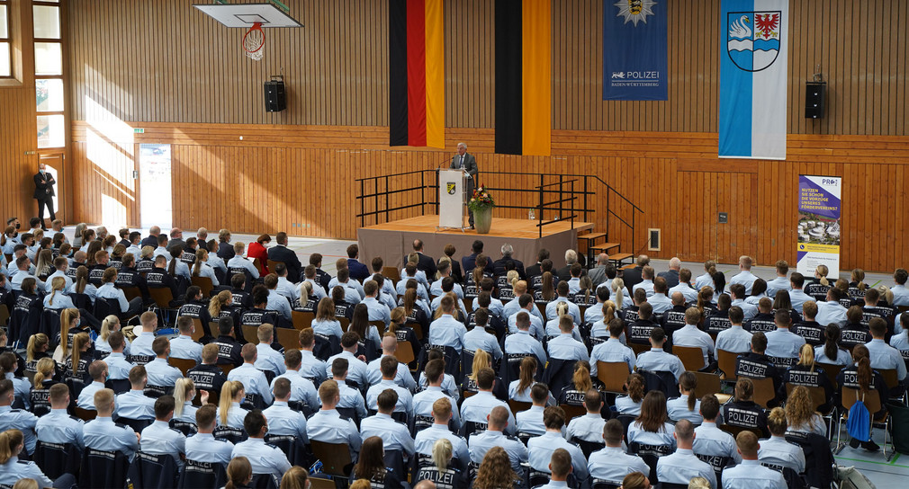 „Die größte Einstellungsoffensive in der Geschichte der Polizei Baden-Württemberg läuft auch im Jahr 2021 ungebrochen weiter: Insgesamt haben 2021 rund 1.400 junge Menschen – rund 750 Polizeimeisteranwärterinnen und -anwärter sowie 650 Polizeikommissaranwärterinnen und -anwärter – ihre Ausbildung bei der Polizei Baden-Württemberg begonnen. Somit haben in den Jahren 2016 bis 2021 insgesamt 9.099 junge Menschen bei der Polizei des Landes Baden-Württemberg ihre Ausbildung begonnen. Diese Zahlen belegen eindrucksvoll den großartigen Erfolg der noch andauernden Einstellungsoffensive – die im Übrigen auch in der gerade begonnenen neuen Legislaturperiode fortgeführt werden soll, 2022 mit mehr als 1.300 neuen Anwärterinnen und Anwärtern. Am Ende steht das Ziel: mehr Sicherheit durch mehr Polizistinnen und Polizisten“, erklärt der stellvertretende Ministerpräsident und Innenminister Thomas Strobl in Villingen-Schwenningen: Hier wurde an der Hochschule für Polizei der erste Studienjahrgang begrüßt, nachdem die neuen Schwerpunktstudiengänge mit dem Abschluss Bachelor of Arts - Polizeivollzugsdienst / Police Service das Qualitätssiegel des Akkreditierungsrates erhalten haben. Der Studienjahrgang umfasst rund 850 Studierende.