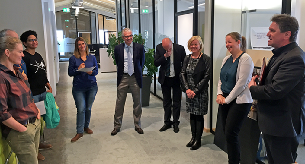 Bei einem Besuch des Unternehmens VAUDE in Tettnang haben sich Integrationsminister Manne Lucha und Christian Rauch, Chef der Regionaldirektion Baden-Württemberg der Bundesagentur für Arbeit, über das Engagement des Unternehmens für die Arbeitsmarktintegration von Flüchtlingen informiert. Die Potenziale von Geduldeten müssten in Zukunft besser genutzt werden, so Lucha.