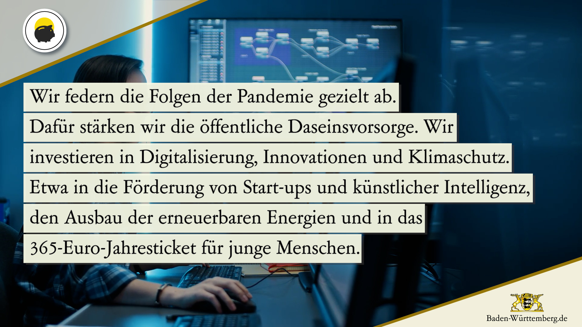 Der Ministerrat hat in seiner heutigen Sitzung den Haushaltsentwurf für 2022 verabschiedet. Das Land wird trotz einer Corona-bedingten Deckungslücke von 3,6 Milliarden Euro keine neuen Kredite aufnehmen, berichtete Finanzminister Dr. Danyal Bayaz. Der Entwurf sieht auch vor, dass knapp eine halbe Milliarde Euro dafür verwendet wird, Schulden abzubauen. Zudem wird in wichtige Zukunftsthemen wie Klimaschutz und Digitalisierung investiert und das Personal unter anderem im Gesundheitsdienst, an den Schulen und in der Justiz gestärkt.