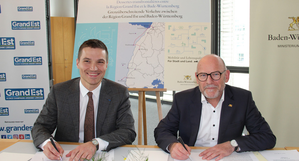 Der baden-württembergische Verkehrsminister Winfried Hermann und der für Mobilität und Verkehrsinfrastruktur zuständige Vizepräsident der französischen Region Grand Est, David Valence, haben am Freitag in Stuttgart eine Verbesserung des grenzüberschreitenden Bahnverkehrs vereinbart. Dazu wurde eine entsprechende Absichtserklärung unterzeichnet, in der sich beide Regionen zu einer Zusammenarbeit im regionalen Schienenverkehr bekennen.