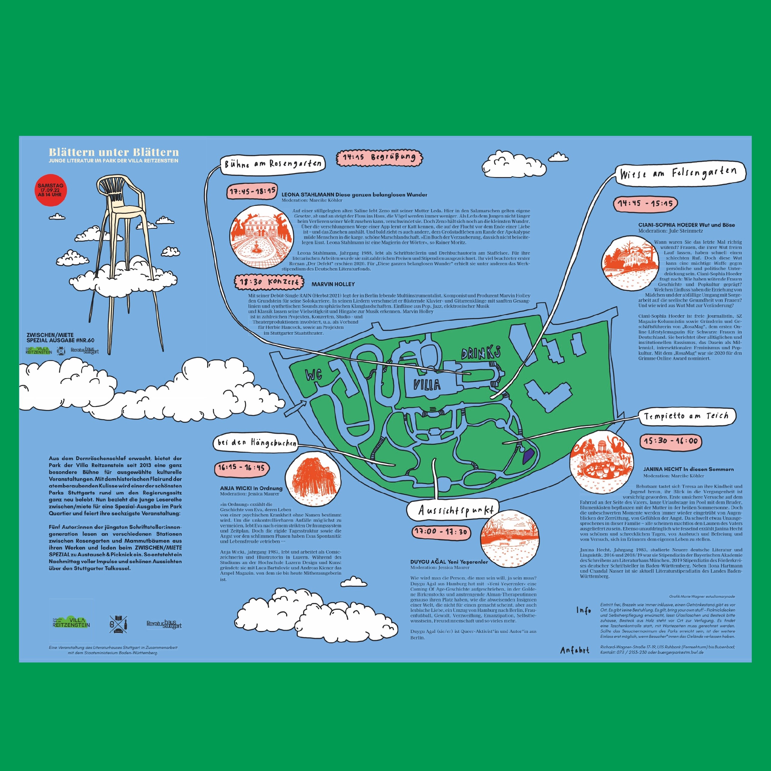 Seit 2013 bietet der Park der Villa Reitzenstein eine ganz besondere Bühne für ausgewählte Kulturveranstaltungen. Am Samstag, 17. September 2022, bezieht die junge Lesereihe „zwischen/miete“ für eine Spezial-Ausgabe im Park Quartier. „Literatur ist ein Motor der Gesellschaft. Sie treibt uns an, mit Fragen der Identität, des Miteinanders oder der Zukunftsvorstellungen umzugehen. Dass gleich fünf Autorinnen der jüngsten Schriftstellergeneration unter dem Motto ‚Blättern unter Blättern‘ an den schönsten Orten des Gartens aus ihren aktuellen Büchern lesen und zum Austausch auffordern, freut mich ganz besonders“, so Ministerpräsident Winfried Kretschmann. „Ich lade alle Bürgerinnen und Bürger herzlich ein, an diesem literarischen Spaziergang zwischen Rosengarten und Mammutbäumen, Tempietto und Hängebuchen teilzunehmen und dabei eine der schönsten Aussichten über den Stuttgarter Talkessel zu genießen.“