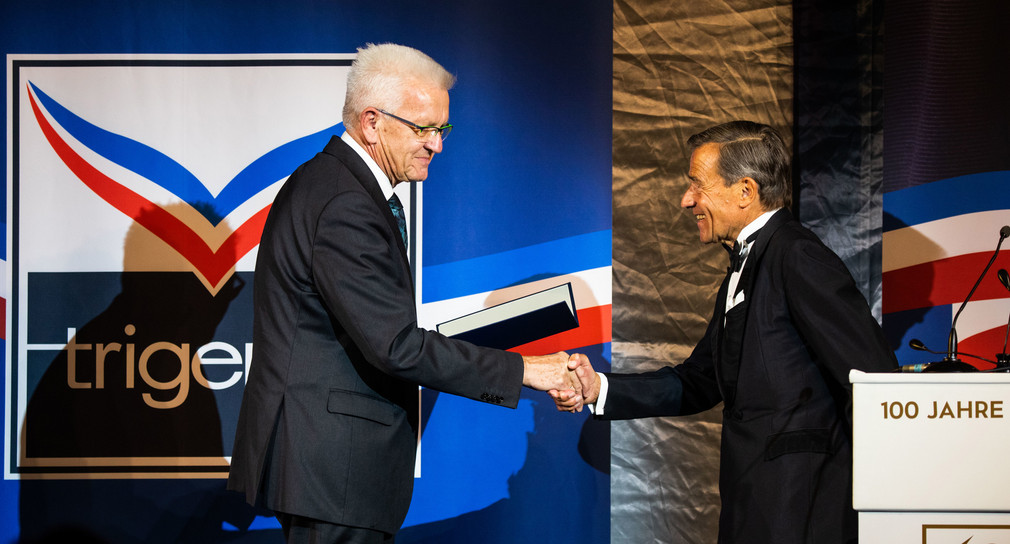 „Wolfgang Grupp hat nicht nur ein großes Herz für seinen Betrieb, sondern auch für seine Heimat. Im Hier und Jetzt brauchen wir Persönlichkeiten wie ihn“, sagte Ministerpräsident Winfried Kretschmann bei den Feierlichkeiten zum 100-jährigen Jubiläum von Trigema in Burladingen anlässlich der Übergabe des Bundesverdienstkreuzes 1. Klasse an den Unternehmer Wolfgang Grupp.