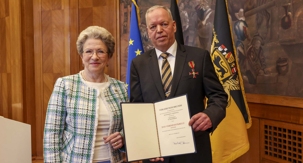 „Prof. Dr. Bernd Kühlmuß ist ein herausragendes Beispiel für verantwortungsbewusstes Handeln, Mitmenschlichkeit und den unermüdlichen Einsatz für Andere“, sagte die Staatsrätin für Zivilgesellschaft und Bürgerbeteiligung, Barbara Bosch, bei der Überreichung des Verdienstkreuzes am Bande des Verdienstordens der Bundesrepublik Deutschland an Prof. Dr. Bernd Kühlmuß am Freitag, 4. April 2025, in Stuttgart.
