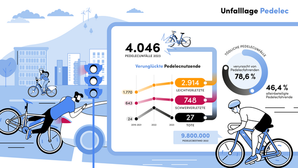 Ein weiterer positiver Trend ist im Radverkehr festzustellen: Die Anzahl der schwerverletzten Radlerinnen und Radler ging um neun Prozent von 2.056 auf 1.876 zurück. 62 Fahrradfahrerinnen und Fahrradfahrer starben (2022: 75), davon waren 27 mit einem Pedelec unterwegs. Der Rückgang bei den getöteten Radfahrerinnen und Radfahrern ist insbesondere auf die deutliche Abnahme getöteter Pedelecnutzerinnen und -nutzer zurückzuführen (2022: 49). 24 Radfahrende verunglückten ohne Fremdbeteiligung. Über 80 Prozent der tödlichen Verkehrsunfälle verursachten die Fahrradfahrerinnen und -fahrer selbst.