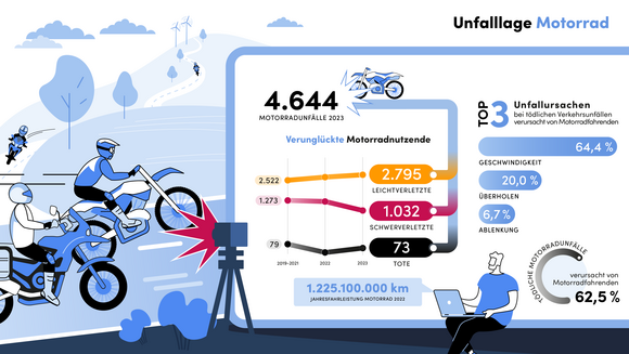 Im vergangenen Jahr hat die Polizei mit insgesamt 4.644 Motorradunfällen (2022: 4.744) rund zwei Prozent weniger Motorradunfälle registriert. Hierbei starben 73 Motorradfahrerinnen und -fahrer, sieben mehr als im Vorjahr. Bei den Schwerverletzten ist ein positiver Trend festzustellen: Mit 1.032 Verunglückten gehen die Zahlen deutlich, um 17 Prozent, zurück (2022: 1.246). 60 Prozent der Verkehrsunfälle mit Personenschaden verursachten die Bikerinnen und Biker selbst. „Die Sicherheit der Bikerinnen und Biker hat höchste Priorität. Wir lassen in unseren Bemühungen nicht nach, die Motorradsicherheit auf den Straßen in Baden-Württemberg zu erhöhen. Mit dem 5-Punkte-Plan sind wir hierbei ganz auf der Spur – die Maßnahmen zahlen sich nach und nach aus“, führte Innenminister Thomas Strobl aus.