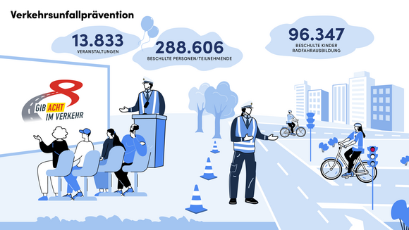 Bei insgesamt 13.833 Präventionsveranstaltungen (2022: 12.992) hat die Polizei 288.606 Menschen (2022: 241.543) zielgruppenorientiert erreicht. Das ist gegenüber dem Vorjahr ein Anstieg um mehr als 19 Prozent. In den Veranstaltungen sollen die Teilnehmerinnen und Teilnehmer für Unfallgefahren sensibilisiert und verkehrsgerechtes und -sicheres Verhalten vermittelt werden. Rund um die Hauptunfallursachen und Risikofaktoren standen dabei die Themen Geschwindigkeit, Verkehrstüchtigkeit, Ablenkung und Sicherungseinrichtungen im Vordergrund. Allein mit dem Thema Alkohol, Drogen und Medikamente hat die Polizei knapp 50 Prozent mehr Menschen erreicht als im Vorjahr (2023: 42.794; 2022: 29.080).