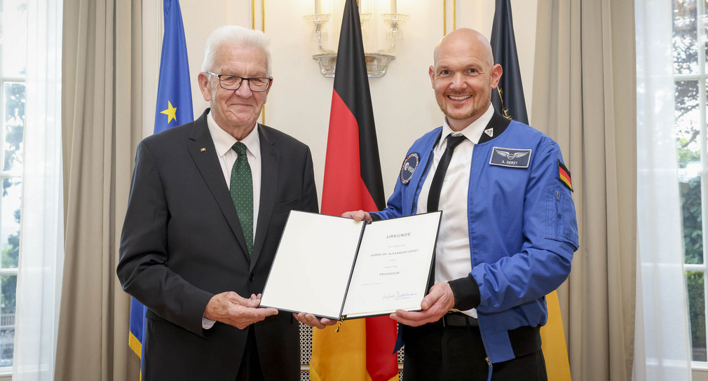 „Sie haben mit Ihren Bildern und Videos aus dem All Millionen Menschen erreicht. Und als Sie wieder auf der Erde waren, haben Sie Schülerinnen und Schülern in Klassenzimmern erklärt, warum Wissenschaft spannend ist. Sie haben gezeigt: Naturwissenschaft ist konkret, anschaulich, sie ist lebendig“, sagte Ministerpräsident Winfried Kretschmann in der Villa Reitzenstein in Stuttgart anlässlich der Verleihung des Ehrentitels Professor an Dr. Alexander Gerst am 13. Mai 2025. „Sie haben aus dem All auf unsere Welt geschaut – nicht ‚von oben herab‘, sondern mit Respekt. Mit Demut, Staunen und großem Forschergeist“, unterstrich der Ministerpräsident.