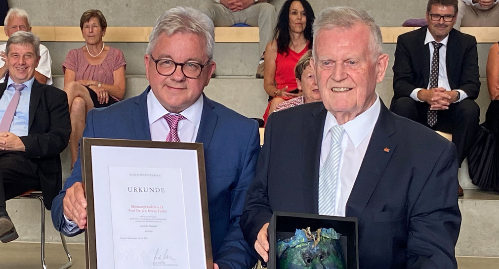 Europaminister Guido Wolf hat Ministerpräsident a. D. Prof. Dr. h.c. Erwin Teufel für sein besonderes Wirken und seine Verdienste um die europäische Einigung als „Gesicht Europas“ gewürdigt. In einer kleinen Feierstunde mit Familienmitgliedern und Wegbegleitern Teufels, darunter auch Ernst Pfister, Wirtschaftsminister a.D. und von 2004 bis 2006 Stellvertretender Ministerpräsident, in der Erwin-Teufel-Schule in Spaichingen sagte Wolf: „Erwin Teufels Leistungen als Ministerpräsident von Baden-Württemberg sind mehr als beachtlich. Dafür ist er völlig zurecht vielfach geehrt und ausgezeichnet worden. Was aber bislang noch unterblieb, ist eine ausdrückliche Würdigung seiner immensen europapolitischen Verdienste. Dabei gibt es nur Wenige, die sich in Beruf, Politik und Ehrenamt in so besonderem Maße um Europa verdient gemacht haben.“