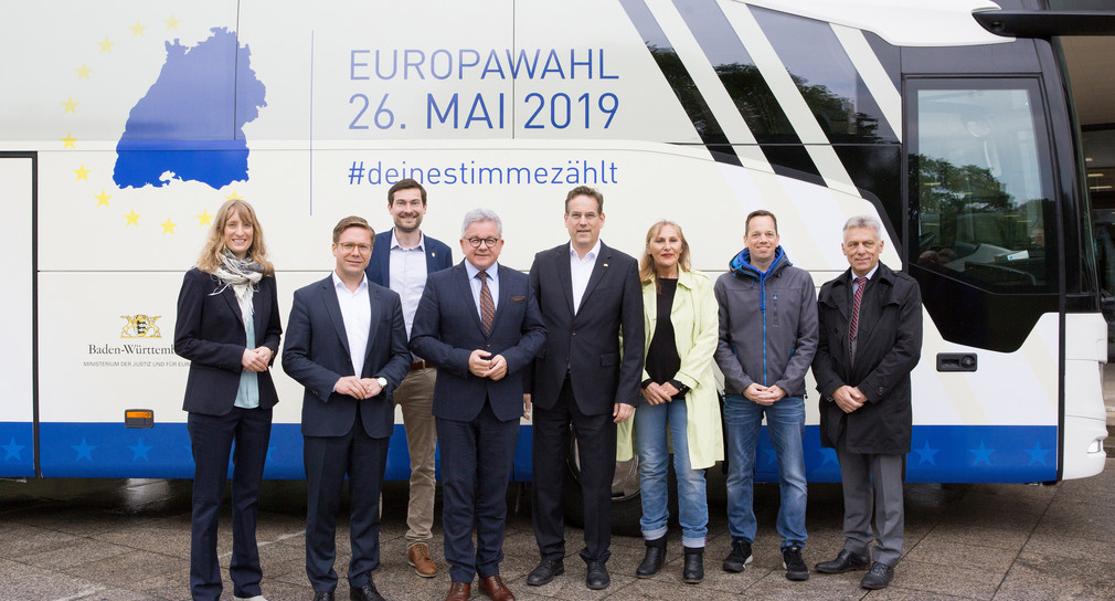 Das Ministerium der Justiz und für Europa führt ab dem 6. Mai 2019 im Vorfeld der Europawahl am 26. Mai eine Bustour im Rahmen der Europawahlkampagne des Landes Baden-Württemberg unter dem Motto „#deinestimmezählt“ durch. Die dreiwöchige Bustour soll Wahlberechtigte anregen, am 26. Mai 2019 bei der Wahl zum Europäischen Parlament ihre Stimme abzugeben. Sie ist das Herzstück der Europawahlkampagne und wird in Kooperation mit dem Verband baden-württembergischer Omnibusunternehmer (WBO), der Landeszentrale für politische Bildung Baden-Württemberg und dem Volkshochschulverband Baden-Württemberg durchgeführt. Europaminister Guido Wolf stellte die Bustour mit dem Vorstandsvorsitzenden, Klaus Sedelmeier, sowie dem Geschäftsführer des WBO, Dr. Witgar Weber, vor dem Landtag vor.