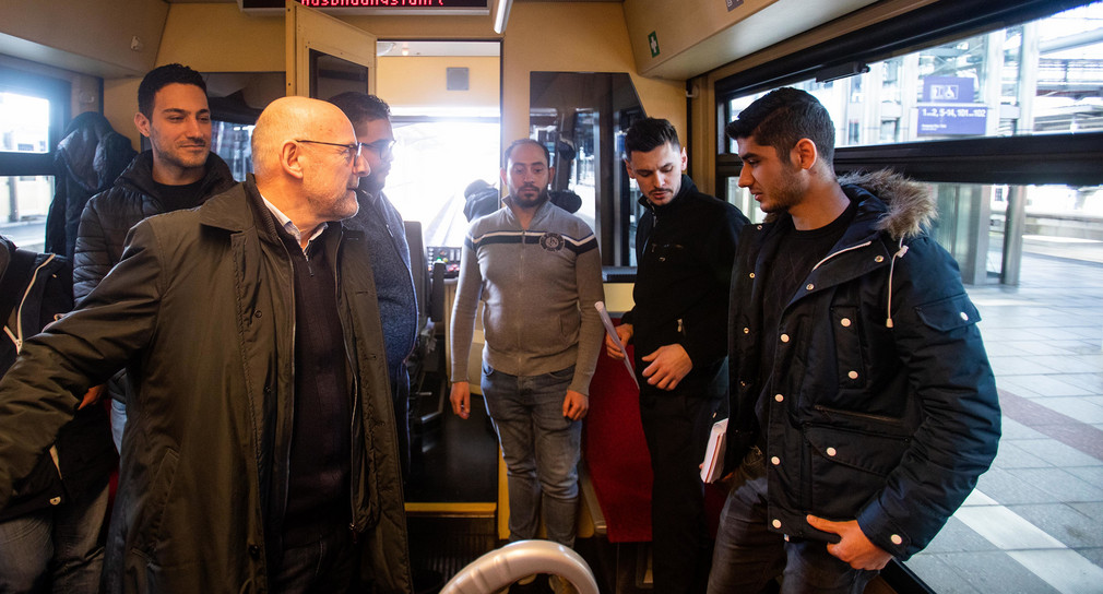 Verkehrsminister Winfried Hermann hat sich bei einer Stadtbahnfahrt mit Flüchtlingen ausgetauscht, die zu Lokführern ausgebildet werden. Das Modellprojekt gibt Geflüchteten eine berufliche Perspektive, die Eisenbahnunternehmen gewinnen neue Fachkräfte.