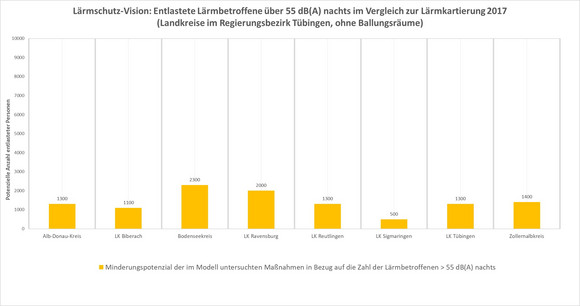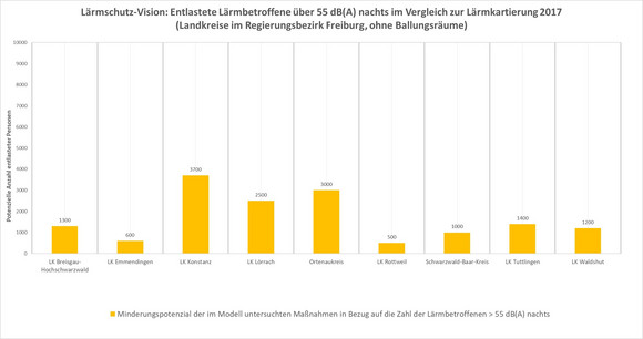 Die Diagramme oben zeigen das Lärmminderungspotenzial der untersuchten „Lärmschutz-Vision“ unterteilt nach Regierungsbezirken auf Landkreisebene auf. Landesweit würden in Baden-Württemberg durch den umfassenden Einsatz lärm-mindernder Fahrbahnbeläge sowie die Anordnung von Tempo 30 mehr als 73.000 Menschen, die heute entlang von Hauptverkehrsstraßen Lärmpegeln über 55 Dezibel in der Nacht ausgesetzt sind, entlastet werden.