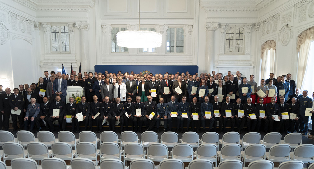 Für ihren Einsatz im Zusammenhang mit den schweren Unwettern im Sommer 2024 erhielten die geehrten Einsatzkräfte jeweils eine Medaille und eine Urkunde. Gleichzeitig wurde ein Teil der Einsatzkräfte, die im vergangenen Jahr auch in Bayern im Einsatz waren, mit der Bayerischen Fluthelfer-Nadel 2024 geehrt.
