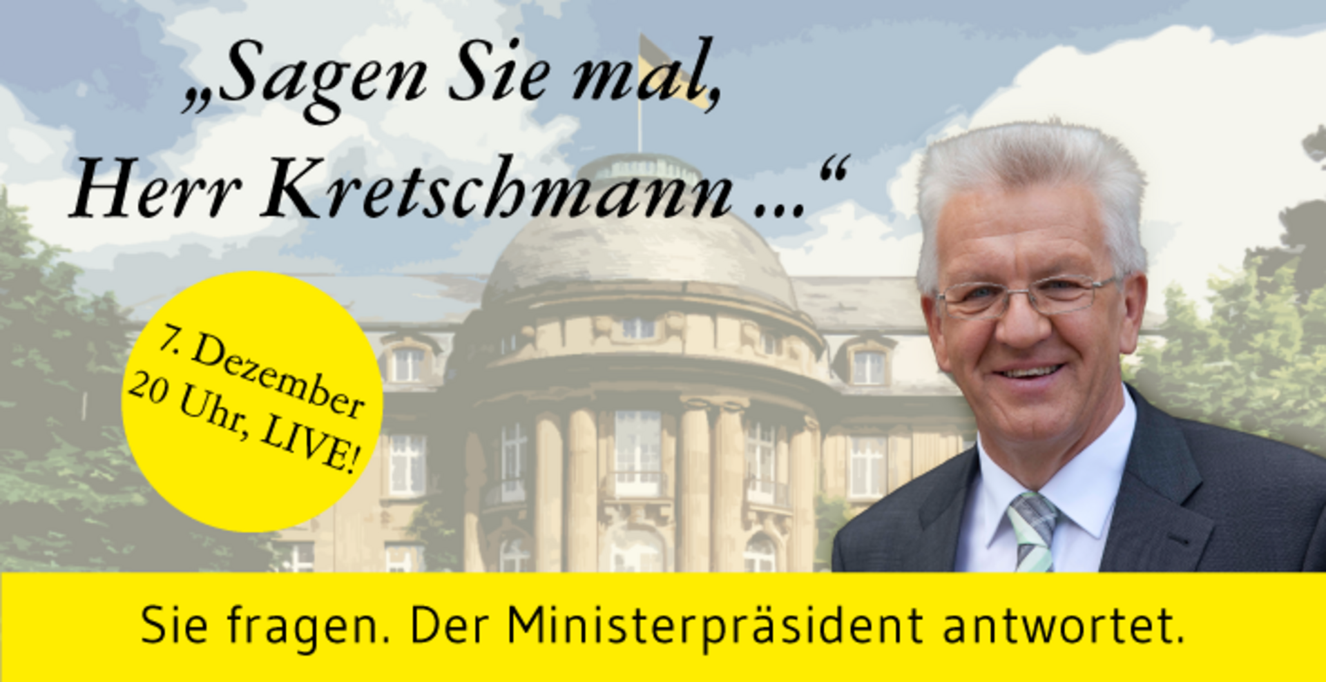 Am 7. Dezember lädt Ministerpräsident Winfried Kretschmann zu seiner Online-Sprechstunde ein. In einer Livesendung beantwortet er die Fragen der Bürgerinnen und Bürger. Mitmachen kann jeder, die Fragen können einfach über die Webseite gestellt werden.