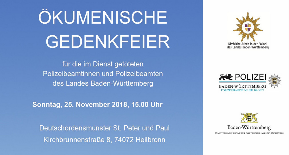 Die diesjährige Veranstaltung findet am Sonntag, dem 25. November 2018, um 15:00 Uhr im Deutschordensmünster St. Peter und Paul in Heilbronn statt. Neben der Ansprache von Innenminister Thomas Strobl wird die liturgische Handlung von Landespolizeipfarrer Bernhard Goetz und Landespolizeidekan Bernhard Metz gestaltet und musikalisch durch das Landespolizeiorchester Baden-Württemberg umrahmt. Neben den Angehörigen der Verstorbenen werden bei der Gedenkfeier auch zahlreiche politische Vertreter aus Bundes- und Landtag sowie Angehörige der Polizei aus dem ganzen Land erwartet. Herzlich willkommen bei dieser öffentlichen Veranstaltung sind auch alle Bürgerinnen und Bürger, die ihre Verbundenheit mit den Opfern zum Ausdruck bringen möchten.