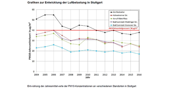 Die Belastung der Luft mit Feinstaub PM10 und Stickoxiden ist in Stuttgart in den vergangenen Jahren dank einer Vielzahl von Maßnahmen zurückgegangen. Gleichwohl werden noch immer die Grenzwerte für Feinstaub PM10 und Stickstoffdioxid (NO2) vor allem entlang vielbefahrener Straßen überschritten. Bei Feinstaub PM 10 gilt dies auf einer Streckenlänge von etwa fünf Kilometern und bei NO2 auf knapp 70 Kilometer Länge. Das Land geht diese Herausforderung mit einem neuen Luftreinhalteplan an, dessen Entwurf Verkehrsminister Winfried Hermann und der Stuttgarter Regierungspräsident Wolfgang Reimer vorgelegt haben. Darin werden die verbindlichen Maßnahmen beschrieben, die ergriffen werden müssen, um die von der EU vorgegebenen Grenzwerte schnellstmöglich und dauerhaft einzuhalten.