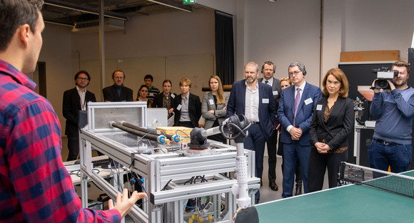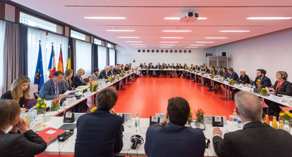 Bereits am Vormittag besuchten Staatssekretär und Bevollmächtigter beim Bund Volker Ratzmann, die Staatsekretärin im Wissenschaftsministerium Petra Olschowski, der Staatsekretär im Umweltministerium Andre Baumann und der Präsident der Région Grand Est Jean Rottner das Cyber Valley in Tübingen. Dort erhielt die Delegation einen Einblick in die Arbeit der Wissenschaftlerinnen und Wissenschaftler am Max-Planck-Institut. Am Nachmittag standen bei den Arbeitsgesprächen mit den französischen Gästen der Konferenz zur grenzüberschreitenden Zusammenarbeit dann die Themen Bildung, Wissenschaft, Sicherheit, Umwelt, Mobilität, Industrie 4.0 und Künstliche Intelligenz im Vordergrund.