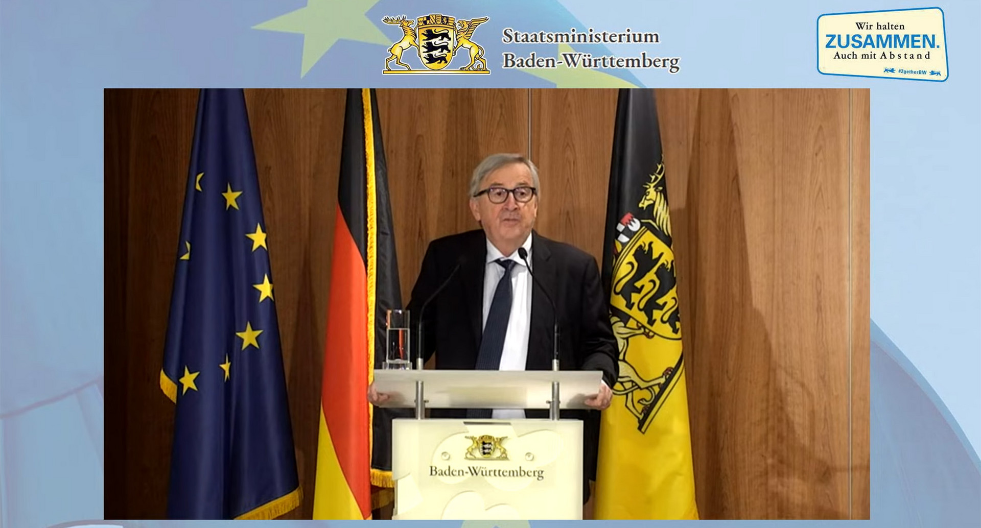„Derzeit lebt ganz Europa zwischen Hoffen und Bangen: Überall erleben wir die Angst vor dem Corona-Virus. Aber wir erleben auch Solidarität und Miteinander. Die Europäische Union muss in der Corona-Krise zusammenstehen“, so Ministerpräsident Winfried Kretschmann im Rahmen der Veranstaltungsreihe „Stuttgarter Rede zu Europa“. Begrüßt vom Minister der Justiz und für Europa Guido Wolf hielt in diesem Jahr der ehemalige Präsident der Europäischen Kommission Jean-Claude Juncker in einer virtuellen Veranstaltung die Rede. Im Anschluss diskutieren Jean-Claude Juncker und Winfried Kretschmann zur Gegenwart und Zukunft der EU.