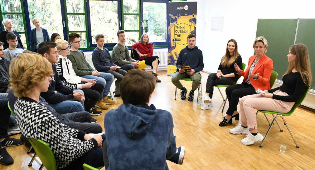 „Start-up BW@School“ ermöglicht Schülerinnen und Schülern ab der neunten Klasse, Gespräche mit Gründerinnen und Gründern aus der Region zu führen. Das Treffen mit den Unternehmerinnen und Unternehmern wird in den Klassen mit Hilfe eines Workbooks vorbereitet, so dass ein lebendiges Gespräch entsteht. Ziel ist es, den Horizont der Schülerinnen und Schüler um die Möglichkeiten und Chancen einer beruflichen Selbstständigkeit zu erweitern und ihnen das Gründen als berufliche Perspektive zu eröffnen.