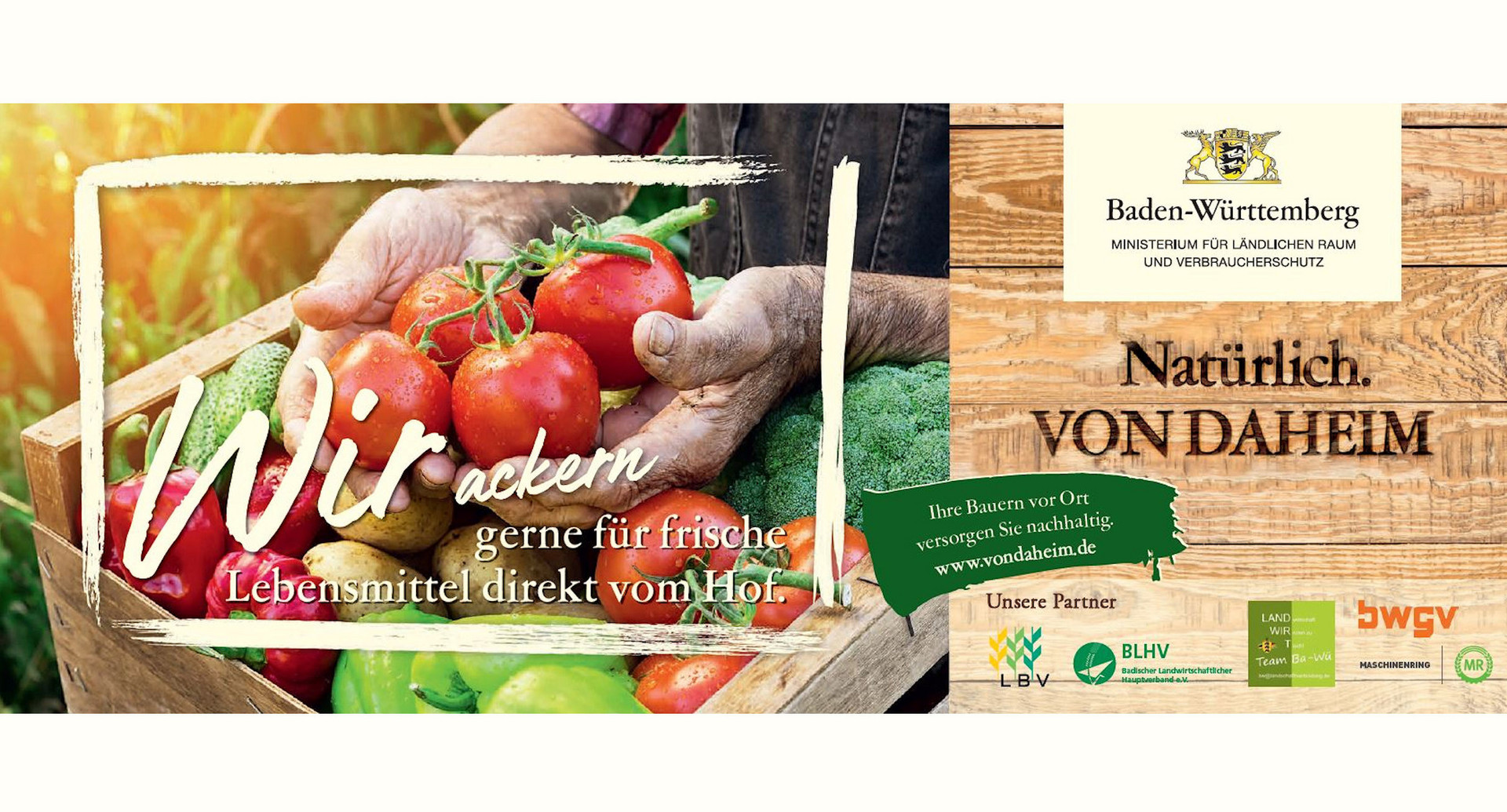 In den kommenden Wochen wird das Ministerium für Ländlichen Raum und Verbraucherschutz im Zuge der Kampagne 20 Bauern und Genossenschaften vorstellen, die insgesamt über 40.500 landwirtschaftliche Betriebe, zahlreiche Hofläden und Raiffeisenmärkte im Land repräsentieren. Sie alle stehen für über 7.500 Milchviehbetriebe, für über 5.200 schweinehaltende Betriebe, 14.200 Weideviehbetriebe, 7.100 Betriebe mit Hühnerhaltung, 2.700 Schafbetriebe, 4.000 Betriebe, die Baumobst produzieren, 1.200 Betriebe, die unser frisches Gemüse anbauen, 290 Spargelbetriebe, 10.200 Ackerbaubetriebe, aber auch für die über 23.000 Weinbaubetriebe, die unsere Kulturlandlandschaft bewirtschaften und Jahr für Jahr hervorragende Weine herstellen. Auch die über 300 Warengenossenschaften in Baden-Württemberg, die die Kampagne unterstützen, werden auf diesem Wege vorgestellt. Die 20 Bauern und Genossenschaften sind auf Plakaten und Bannern zu sehen, die das Ministerium gemeinsam mit seinen Partnern im ganzen Land aufhängt. Zudem stellen sich die Bauern und die Genossenschaften mit ihren Betrieben in einem Video vor und geben einen Einblick in ihre tägliche Arbeit. Diese Filme werden nach und nach auf Facebook, Instagram und bei „Natürlich. VON DAHEIM“ präsentiert.