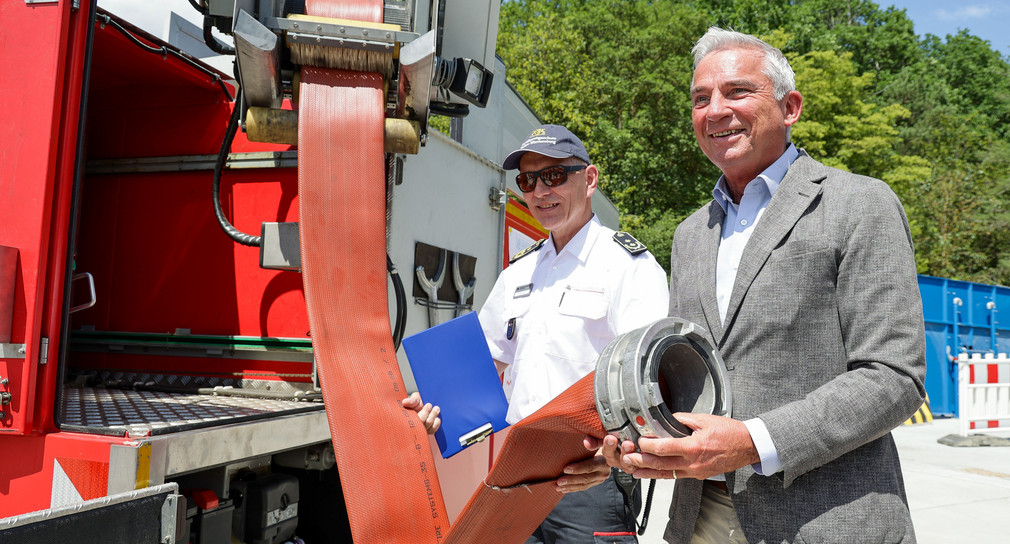 Minister Thomas Strobl und Regierungspräsidentin Sylvia Maria Felder erhielten bei der sogenannten Stationsausbildung, Einblicke in die Ausbildung der Feuerwehrkräfte mit verschiedenen Einsatzmitteln. Diese reichen von einer Drohneneinheit über leistungsstarke Wasserfördersysteme bis hin zu geländetauglichen Gerätewagen. Über 300 Teilnehmende übten zeitgleich an sechs Stationen die unterschiedlichen Ausbildungsszenarien.