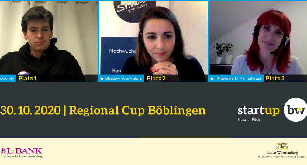 Der Gründungswettbewerb „Start-up BW Elevator Pitch“ sucht derzeit wieder in ganz Baden-Württemberg nach den einfallsreichsten Geschäftsideen und besten Gründerinnen und Gründern im Land. Der Regional Cup Böblingen fand am 30. Oktober 2020 in Kooperation mit dem Landkreis Böblingen und den Senioren der Wirtschaft e.V. virtuell statt. Neun Teams präsentierten ihre Geschäftsideen vor einer Fachjury. Der Regional Cup wurde als Livestream auf dem YouTube-Kanal von Start-up BW übertragen. Das Team „Knowunity (Kurz & Lins UG haftungsbeschränkt)“ aus Sindelfingen überzeugte die Jury und zieht ins Landesfinale 2020 ein.