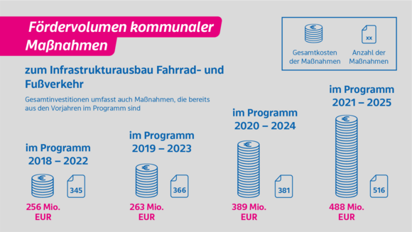 Die Nachfrage der Kommunen nach einer Förderung von Rad- und Fußverkehrsinfrastruktur ist größer denn je. Das neue Förderprogramm des Landes wächst für die Jahre 2021 bis 2025 auf mehr als 500 Maßnahmen mit einem Gesamtinvestitionsvolumen von rund 490 Millionen Euro.