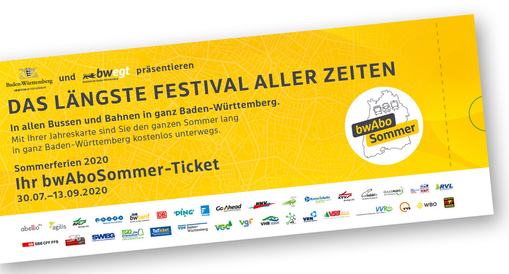 Mit dem bwAboSommer startet am Donnerstag, 30. Juli 2020, die größte Dankeschön-Aktion für Pendlerinnen und Pendler im öffentlichen Nahverkehr (ÖPNV) in der Geschichte des Landes. Bis Sonntag, 13. September, sind alle Jahres-Zeitkarten über alle Verbundgrenzen hinweg in Baden-Württemberg gültig. Das heißt, dass etwa 1,5 Millionen Fahrgäste während der gesamten Sommerferien zusätzlich zu ihrem gekauften Abo auf allen Strecken im Land mit Bus, Bahn und Tram kostenfrei unterwegs sein können. Und das an allen Tagen, von Montag bis Sonntag.