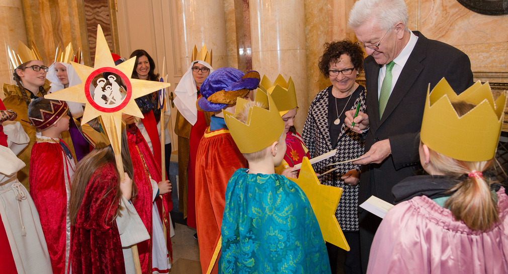 Ministerpräsident Winfried Kretschmann hat gemeinsam mit seiner Ehefrau Gerlinde acht Sternsingergruppen aus Baden-Württemberg im Neuen Schloss in Stuttgart empfangen. Die Sternsingeraktion ermögliche tausenden Kindern auf der ganzen Welt ein besseres Leben, so Kretschmann.