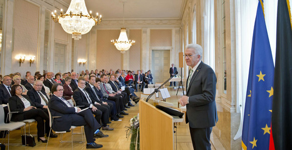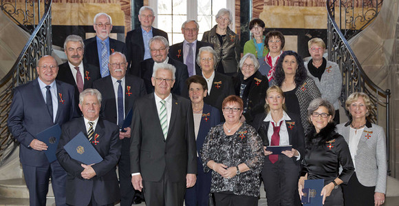 „Ehrenamtlich Engagierte sind Vorbilder, Sinnstifter und Brückenbauer. Durch ihren öffentlichen Einsatz stärken sie den Zusammenhalt in unserem Gemeinwesen und sorgen mit ihrem Engagement dafür, dass aus dem Miteinander in unserer Gesellschaft kein Gegeneinander wird“, so Ministerpräsident Winfried Kretschmann bei der Überreichung des Verdienstkreuzes am Bande des Verdienstordens der Bundesrepublik Deutschland an 20 Bürgerinnen und Bürger anlässlich des Tages des Ehrenamtes im Neuen Schloss in Stuttgart. „Die heute geehrten Damen und Herren haben über eine sehr lange Zeit hinweg auf ganz persönliche Weise und in ganz unterschiedlichen Bereichen Bürgersinn, Engagement und Empathie gezeigt“, betonte Kretschmann.