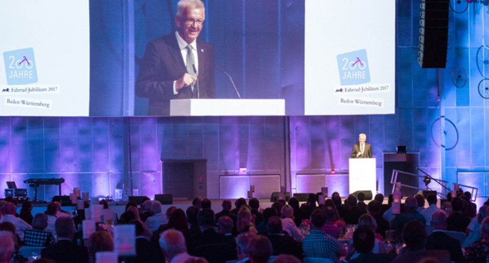 Ministerpräsident Winfried Kretschmann und Verkehrsminister Winfried Hermann haben im Mannheimer Trafowerk gemeinsam mit 300 Gästen aus Politik, Gesellschaft, Sport und Wirtschaft den 200. Geburtstag der Erfindung des Fahrrads gefeiert. Die Jungfernfahrt vor 200 Jahren markiere den Urknall der individuellen Mobilität, so Kretschmann.