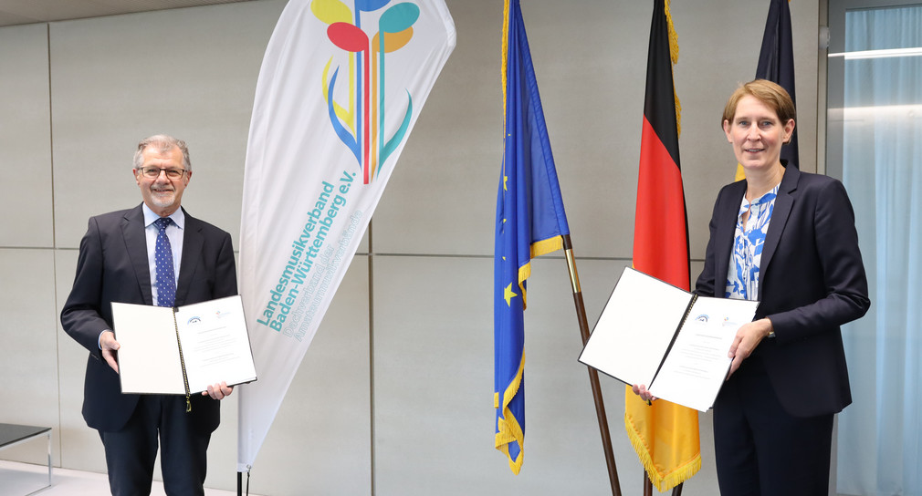 Am heutigen Tag unterzeichneten Landespolizeipräsidentin Dr. Stefanie Hinz für das Innenministerium und Klaus Peter Mungenast als Schatzmeister und Vertreter des Landesmusikverbandes nun einen gemeinsamen Kooperationsvertrag. Ziel der Kooperation ist es, die Vernetzung zwischen Profi- und Amateurmusik zu intensivieren und damit die Entwicklung der Musikkultur in Baden-Württemberg nachhaltig zu fördern.