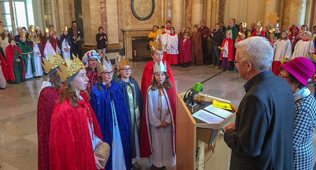 Ministerpräsident Winfried Kretschmann und seine Frau Gerlinde Kretschmann haben im Neuen Schloss in Stuttgart Sternsingerinnen und Sternsinger aus ganz Baden-Württemberg empfangen. Die Sternsingergruppen geben mit Spenden armen Kindern Hoffnung. Im vergangenen Jahr haben sie allein in Baden-Württemberg 9,5 Millionen Euro gesammelt.