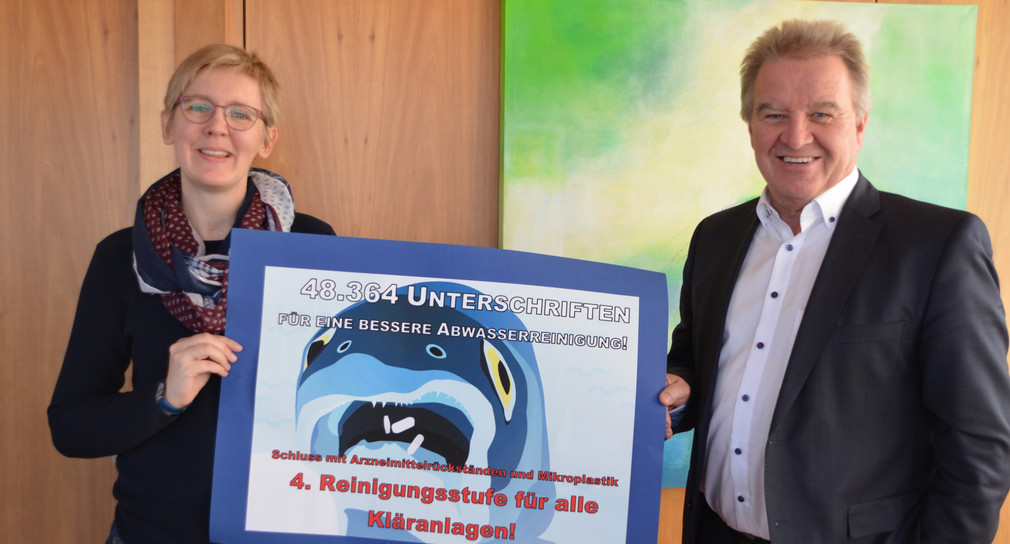 Umweltminister Franz Untersteller freut sich, dass über die vierte Reinigungsstufe von kommunalen Kläranalagen nun auch in der Öffentlichkeit diskutiert wird. Dazu beigetragen hat die Online-Petition von Christina Bosch aus Blaubeuren (Alb-Donau-Kreis), die bereits mehr als 48.000 Menschen unterschrieben haben. Und die sie an Untersteller überreichte. Sie fordert darin, dass die vierte Reinigungsstufe verbindlich in Deutschland eingeführt werden sollte, weil sie Spurenstoffe zum Beispiel Rückstände von Arzneimittelwirkstoffen aus dem Abwasser herauszufiltern vermag.