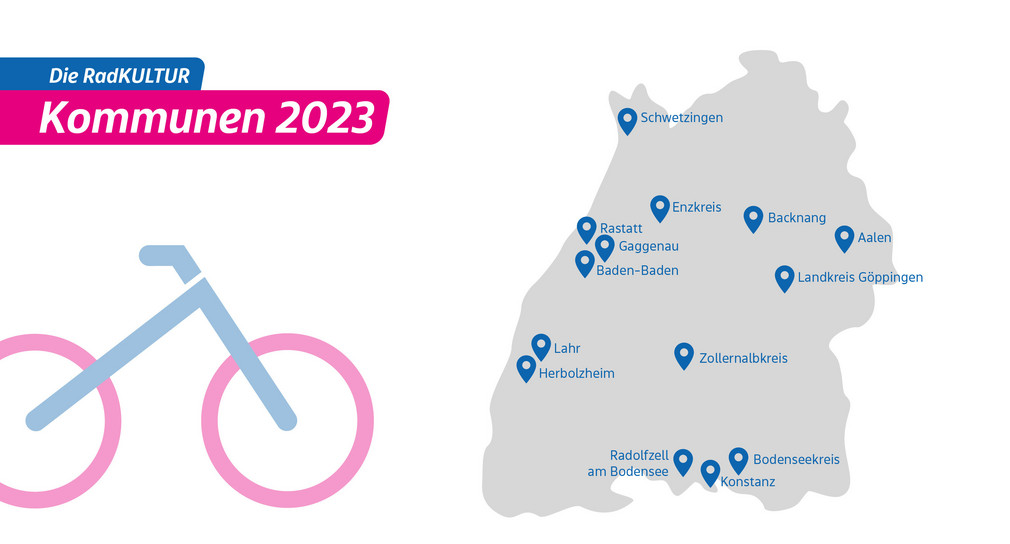 Gemeinsam in die Pedale treten – dieses Ziel verfolgt die Initiative RadKULTUR des Verkehrsministeriums Baden-Württemberg auch 2023 mit 14 Förderkommunen verteilt im ganzen Bundesland. Die Förderkommunen können sich auf ein abwechslungsreiches Fahrradjahr freuen: Kommunale Lastenräder, Mitmachaktionen wie die RadSchnitzeljagd, Aktionstage, STADTRADELN, RadService-Punkte und neue Mobilitätsideen vor Ort ermutigen die Bürgerinnen und Bürger, das Auto stehen zu lassen und stattdessen auf das Fahrrad umzusteigen. Die ausgewählten Kommunen führen in enger Zusammenarbeit mit der Landesinitiative jeweils individuell abgestimmte Aktionen durch, die das Fahrrad als Alltagsfahrzeug in das Bewusstsein der Menschen rücken sollen. Ziel ist es, das eigene Rad neu zu entdecken und fahrtauglich zu machen, die vielfältigen und gut ausgebauten Radwege vor Ort kennenzulernen und Freude an der nachhaltigen, gesunden und unkomplizierten Mobilitätsform zu wecken.