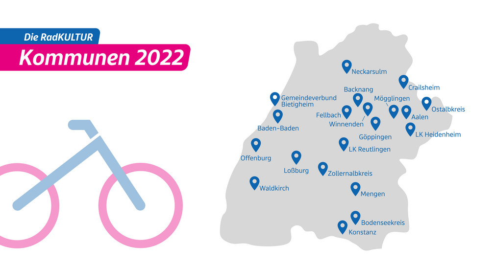 Folgende 14 Kommunen werden zum ersten Mal durch die Initiative RadKULTUR gefördert: Backnang, der Gemeindeverbund Bietigheim, Crailsheim, Fellbach, Göppingen, Loßburg, Mögglingen, Offenburg, Waldkirch und Winnenden sowie die Landkreise Heidenheim, Ostalbkreis, Reutlingen und der Zollernalbkreis. Mehrere Kommunen haben schon Erfahrungen mit der Förderung der Initiative RadKULTUR gemacht: Die Städte Mengen und Neckarsulm starten in das zweite Jahr ihrer Förderung, die sie im vergangenen Jahr begonnen haben. Die Städte Aalen, Baden-Baden und Konstanz sowie der Bodenseekreis können an eine bereits erfolgte Förderung anknüpfen. Mit Bietigheim, Elchesheim-Illingen und Muggensturm fördert die RadKULTUR erstmalig einen Gemeindeverbund. Von der Zusammenarbeit der Gemeinden profitiert die Radverkehrskommunikation, denn Radfahren hört nicht an Gemeindegrenzen auf.