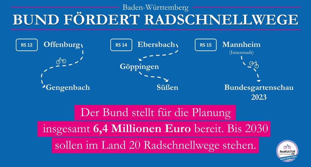 Gefördert werden die geplanten Radschnellverbindungen Offenburg – Gengenbach, Ebersbach – Göppingen – Süßen sowie ein Teilabschnitt der Verbindung Mannheim – Viernheim – Weinheim – Darmstadt. Mit dem geförderten Teilabschnitt soll eine Radschnellwegeverbindung zwischen der Mannheimer Innenstadt und dem Gelände der Bundesgartenschau hergestellt werden. Der Bund beteiligt sich mit je 75 Prozent an den Planungskosten.