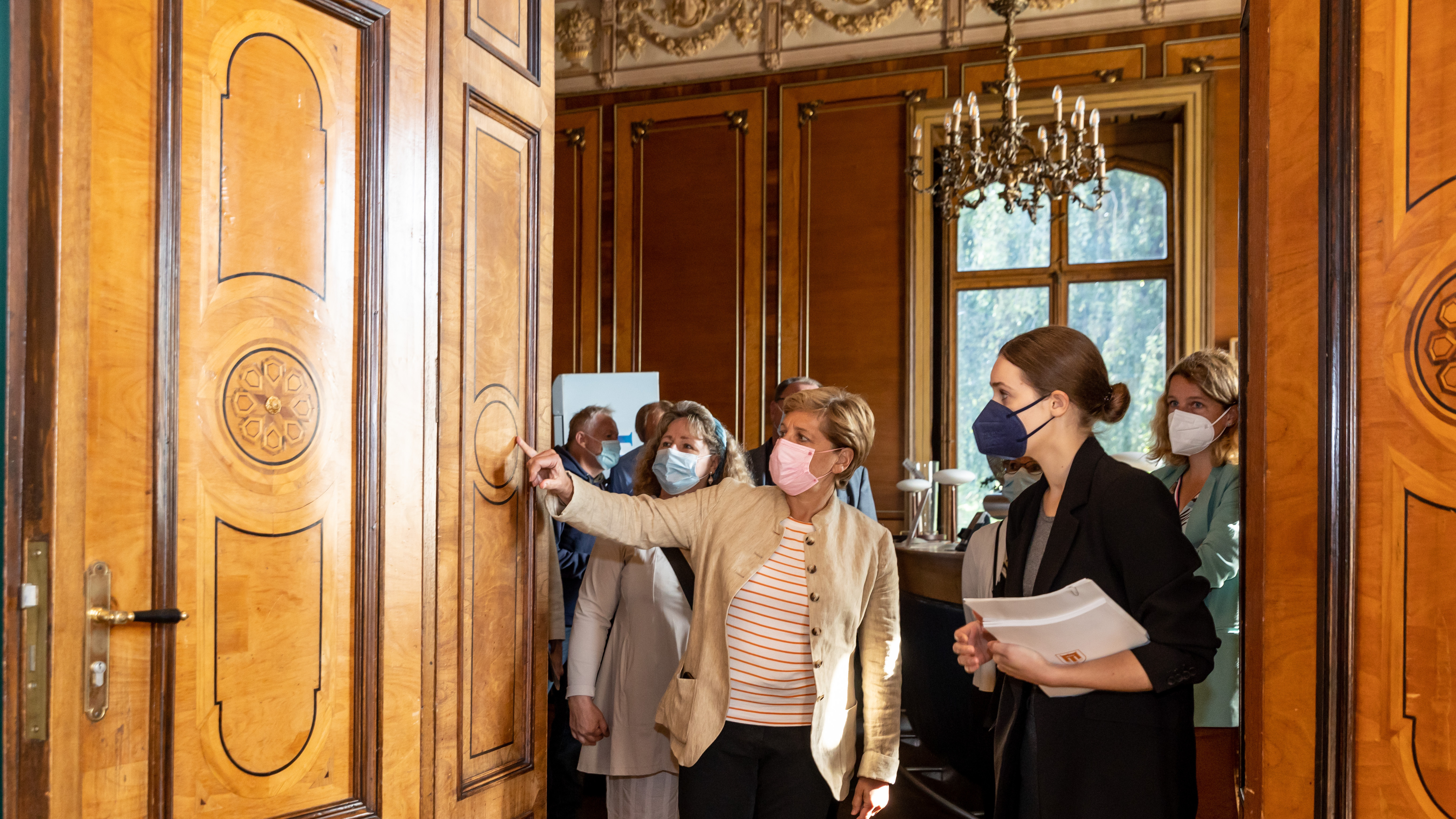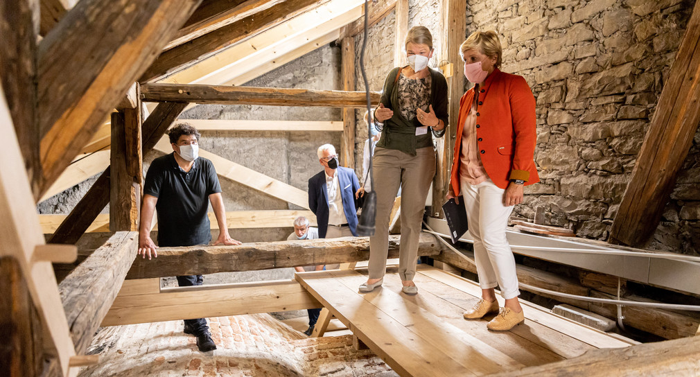 Die Tour des zweiten Tages führte Ministerin Razavi nach Langenargen in das Schloss Montfort, ein bedeutendes Kulturdenkmal und beliebtes Ausflugsziel am Bodensee. Es ist ein wichtiges Beispiel für die orientalisierende Baukunst des 19. Jahrhunderts in Deutschland. Die kastellartige Schlossanlage liegt auf einer Landzunge im Bodensee und ist von einer massiven Mauer umgeben. Im Frühjahr wurde mit den Instandsetzungsarbeiten an der Ufermauer begonnen. „Ich bin dankbar, dass sich die Mitarbeiterinnen und Mitarbeiter der Landesdenkmalpflege dieser anspruchsvollen Aufgabe täglich mit großem Engagement und Expertise widmen“, sagt Razavi.