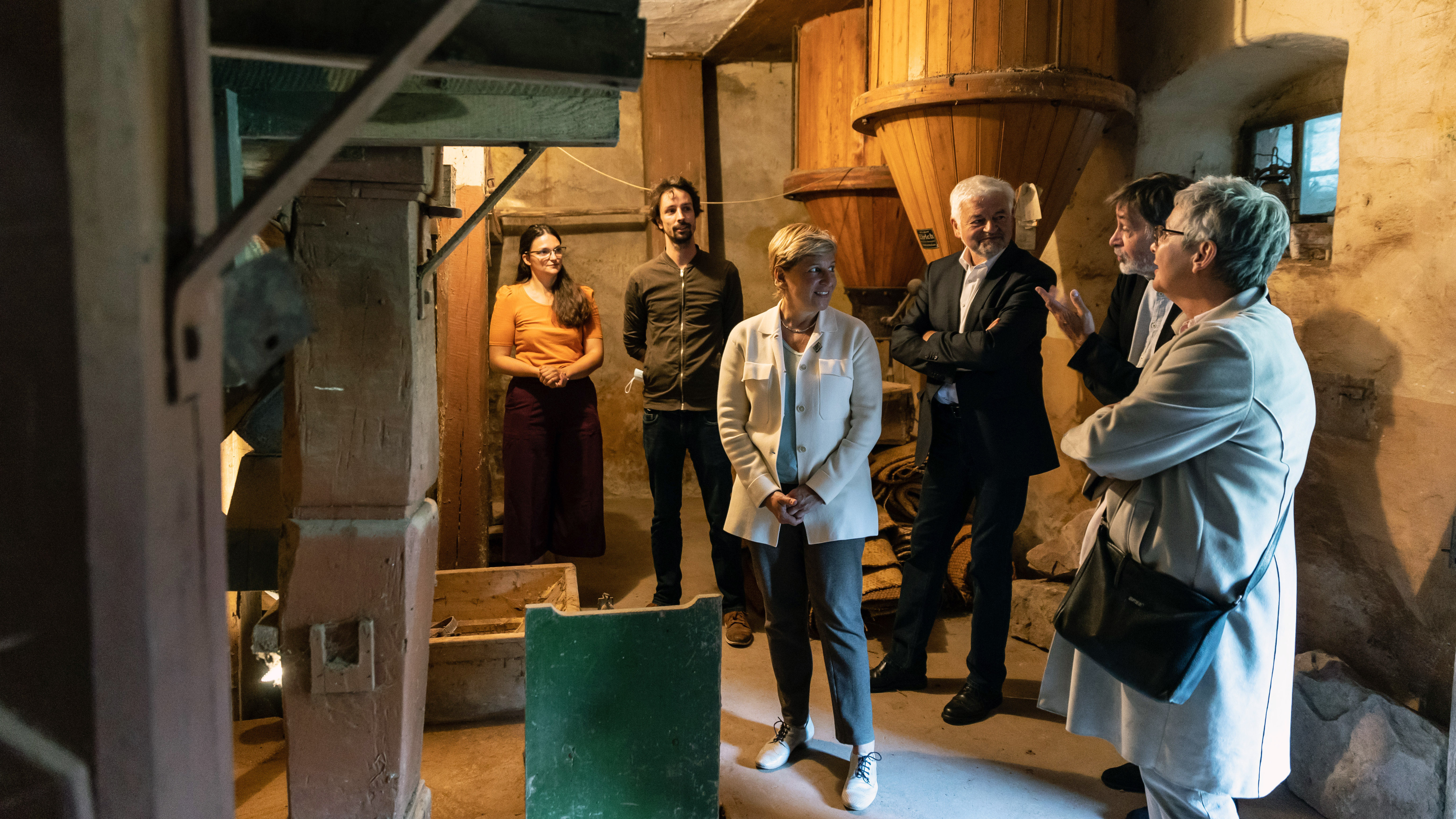 Ihre Tagestour startete Ministerin Razavi bei der sogenannten Oberen Mühle, die letzte von einst drei Mühlen am Amorsbach. Das insgesamt drei Geschosse zählende Hauptgebäude des Mühlenanwesens steht in leichter Hanglage und wurde im Erdgeschoss massiv, in den beiden Obergeschossen als Fachwerkkonstruktion ausgeführt. Eine inschriftliche Datierung am Rundbogentor des Gewölbekellers weist darauf hin, dass das massive Erdgeschoss aus dem späten 16. Jahrhundert stammt. Im Inneren beherbergt das Gebäude neben der Mühlentechnik, eine großzügige Wohneinheit, die mehrere Jahrzehnte in zwei kleine Wohnungen unterteilt war. Prägende Elemente wie Kassettentüren, Dielenböden et cetera aus der Nachkriegszeit sind erhalten. Die von den neuen Eigentümern engagiert verfolgte Sanierung berücksichtigt den spezifischen Charakter dieses Kulturdenkmals. Neben der privaten Wohnnutzung wird eine Öffnung des Gebäudes für die Öffentlichkeit als Schaumühle angestrebt. „Wohnen im Denkmal ist gelebte Nachhaltigkeit. Das große Engagement der Eigentümer und der Erhalt des Kulturdenkmals als privater Wohnraum beeindruckt mich“, betont Razavi.