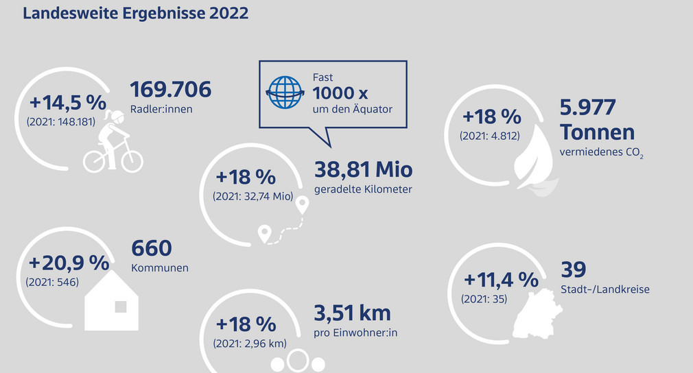 Umweltfreundlich, günstig, flexibel und gesund: Das Fahrrad ist mittlerweile für viele Menschen in Baden-Württemberg nicht nur ein beliebtes Freizeit- oder Sportgerät, sondern fester Bestandteil ihrer Mobilität im Alltag. Die Rad-Begeisterung steckte auch rund 170.000 Menschen in Baden-Württemberg an: In 660 angemeldeten Kommunen sammelten die fleißigen Teilnehmenden zusammen 38,8 Millionen geradelte Kilometer über den gesamten Aktionszeitraum. Genug, um fast 1.000-mal die Erde entlang des Äquators zu umrunden.