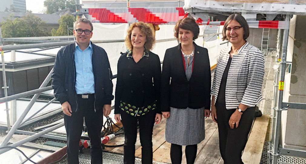 Finanzstaatssekretärin Gisela Splett und die Leiterin der Badischen Landesbibliothek haben sich in Karlsruhe ein Bild vom Fortschritt der Sanierungsarbeiten an der Badischen Landesbibliothek (BLB) gemacht.