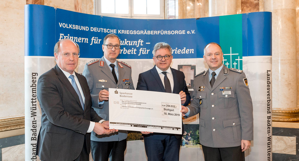 Seit mittlerweile mehr als 96 Jahren nimmt sich der Volksbund in vorbildlicher Weise der Pflege der deutschen Kriegsgräber im Ausland an. Diese Gräber erinnern an das Leid und an die Opfer der Kriege. Mit ihrer Pflege setzt sich der Volksbund für Frieden, Freiheit, Gerechtigkeit und ein würdiges Leben für alle ein. Der stellvertretende Kommandeur des Landeskommandos Baden-Württemberg, Oberst Dieter Bohnert, konnte heute einen Spendenscheck in Höhe von 294.932 Euro übergeben. Dieser Betrag war Ergebnis der im vergangenen Jahr durchgeführten jährlichen Sammelaktion von ehrenamtlichen Helfern der Bundeswehr, Angehörigen der Reservistenverbände und Freiwilligen.