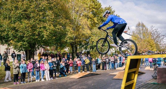 Die 106 Radelnden des Progymnasiums in Altshausen sammelten innerhalb des Aktionszeitraums über 16.870 Kilometer. Das sind durchschnittlich 159 Kilometer pro Kopf. Der Gewinn – ein abwechslungsreiches Fahrrad-Festival für die ganze Schule – begeisterte am Donnerstagnachmittag Groß und Klein: Die Schülerinnen und Schülern lernten von einem BMX-Profi verschiedene Tricks auf dem Rad, die sie anschließend auf einem Pumptrack ausprobieren konnten. Eine Maultaschen-Rikscha versorgte die Kinder und Jugendlichen mit einem leckeren Mittagessen, sie konnten Energie für ihre Schule mit einem Fahrrad erzeugen, an einem Geschicklichkeits-Parcours bei der Verkehrswacht teilnehmen, durch die Fahrradwaschanlage fahren und es sich an der Popcorn-Maschine schmecken lassen. Die lokale Polizei half dabei, Fahrradhelme richtig einzustellen und die Sichtbarkeit der Kinder und Jugendlichen zu erhöhen. Die Verkehrswacht organisierte einen Geschicklichkeitsparcours. An einem Bastelstand konnten Klingeln und Helme mit MOVERS-Reflektorstickern gestaltet werden und ein DJ, Festivalbändchen sowie eine neue RadService-Station rundeten das Fahrrad-Festival ab.