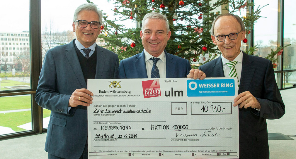 Bei dem Benefizkonzert des Landespolizeiorchesters Baden-Württemberg im Ulmer Münster wurden knapp 11.000 Euro gespendet. Innenminister Thomas Strobl hat heute den Scheck an den WEISSEN RING e.V. sowie die Aktion 100.000 der SÜDWEST PRESSE übergeben.