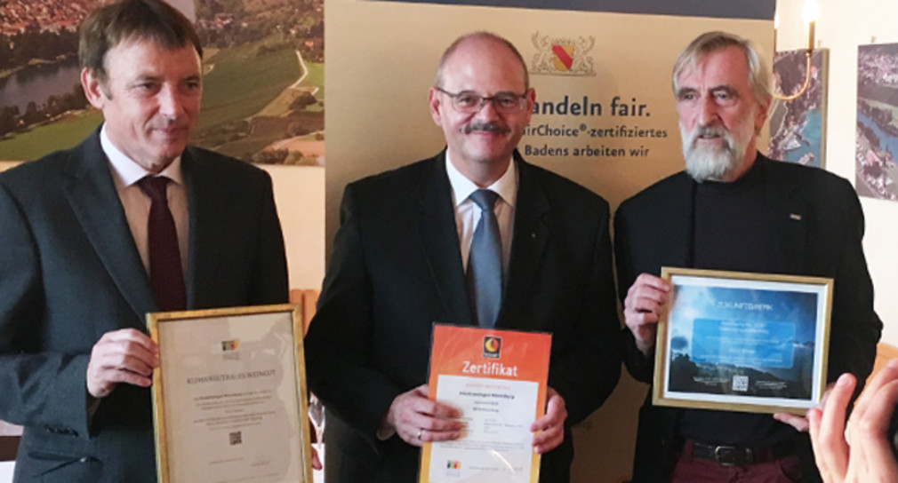 Das Deutsche Institut für Nachhaltige Entwicklung (DINE) hat das Staatsweingut Meersburg zum klimaneutralen Weingut zertifiziert. Prof. Armin Gemmrich vom DINE überreichte Ministerialdirektor Jörg Krauss in Meersburg die Zertifizierungsurkunde.